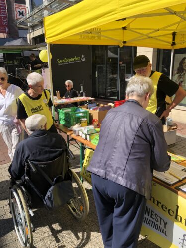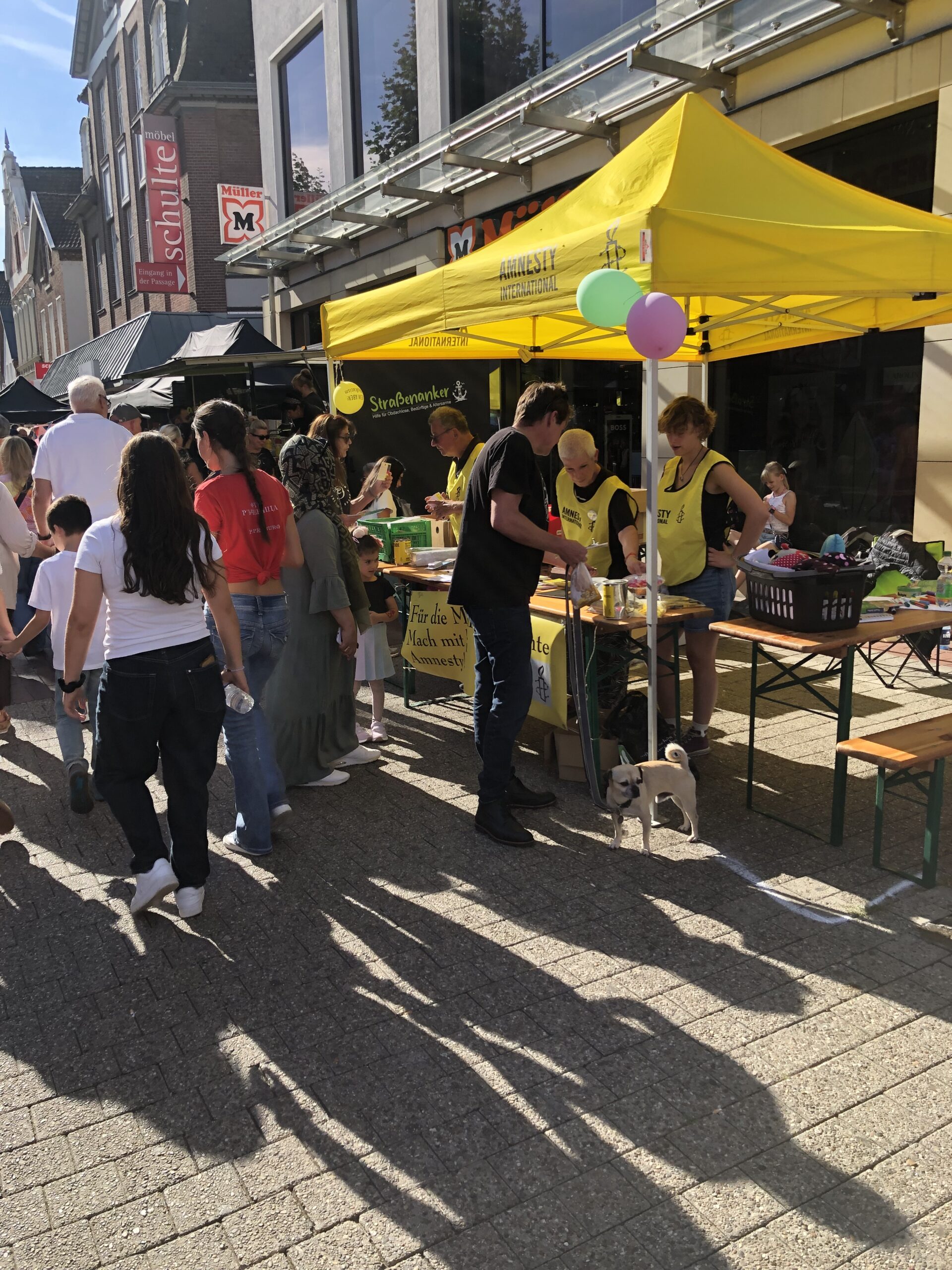 Mit unserem Angebot für die Kleinen (Flohmarktartikel gratis, Bemalen von Baumwolltaschen) und die Großen (Infos zu unserer Arbeit, Petitionen für politische Gefangene im Iran und in Belarus) sind wir gut angekommen.